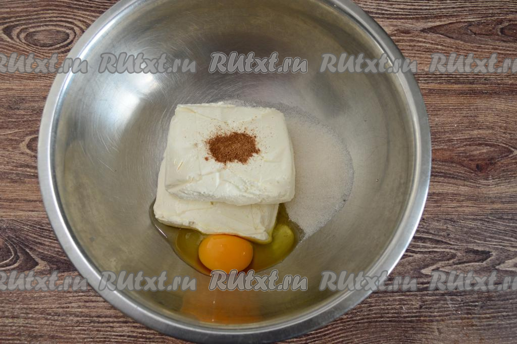 В глубокую миску выложить творог, всыпать корицу и сахар, вбить сырое яйцо.