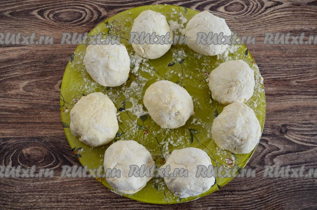На плоскую тарелку, припылённую мукой, выложить все 9 сформированных и обваленных в муке заготовок сырников с яблоком и корицей.
