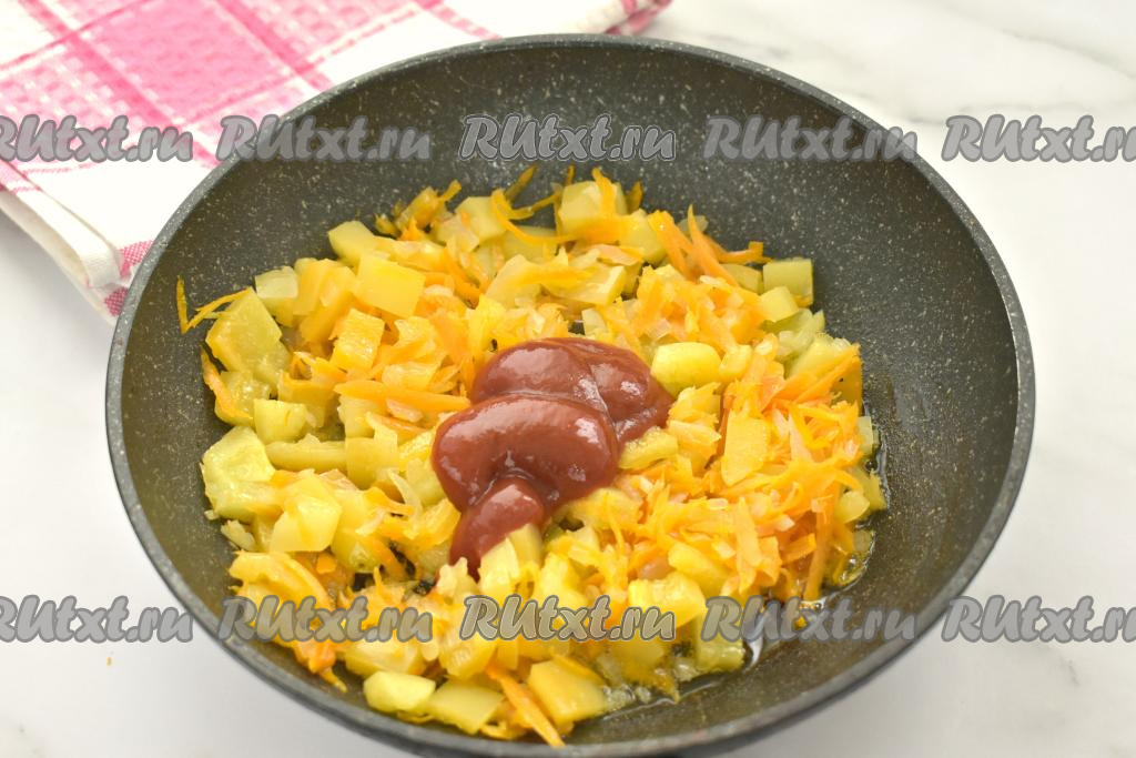 К обжаренным овощам добавляем томатную пасту, перемешиваем, тушим 3-4 минуты, иногда помешивая. Убираем тушёные овощи с огня.