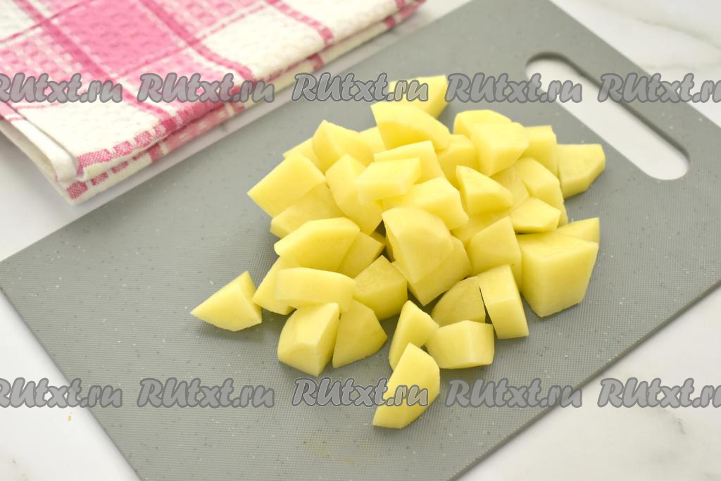Картофель нарезаем на небольшие кубики. В кастрюлю с закипевшим бульоном выкладываем картошку и капусту, доводим до кипения, уменьшаем огонь, варим 20 минут.