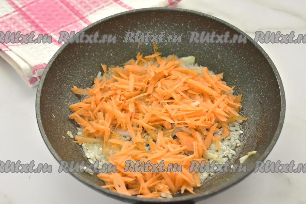 К луку, обжаренному до прозрачности, добавляем морковку, натёртую на крупной тёрке, перемешиваем. Обжариваем овощи, иногда помешивая, 4-5 минут.