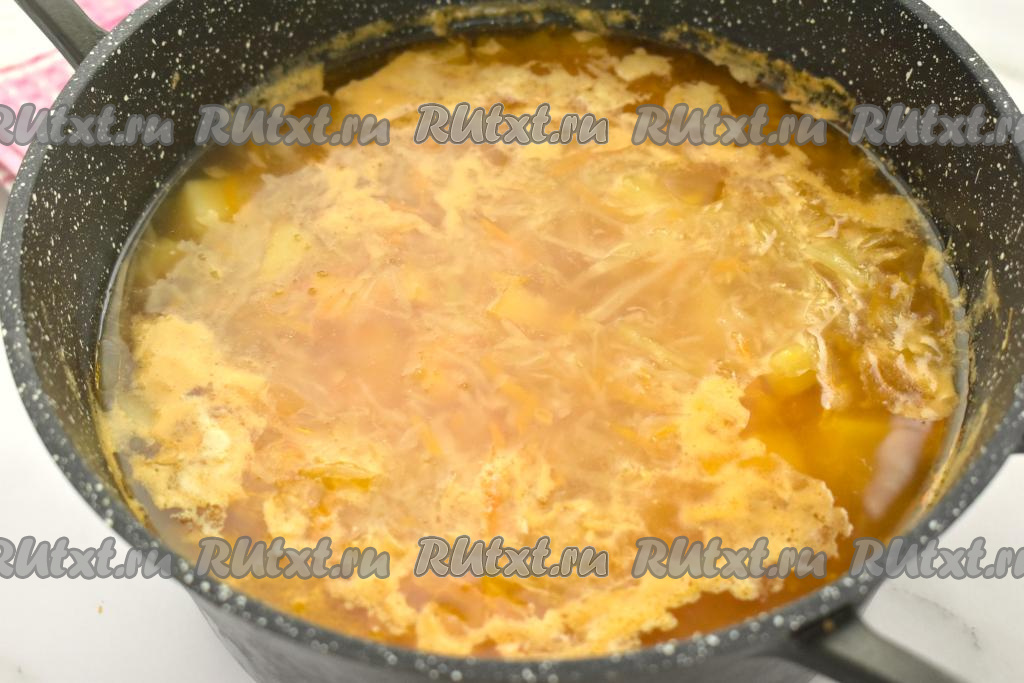 После того как картошка с капустой проварятся с момента закипания бульона 20 минут (овощи должны стать достаточно мягкими), добавляем к ним тушёные овощи со сковороды, перемешиваем, доводим до кипения, если нужно, досаливаем щи из индейки. Уменьшаем огонь, варим 5-7 минут. В конце щи по вкусу перчим, доводим до кипения, убираем с огня.