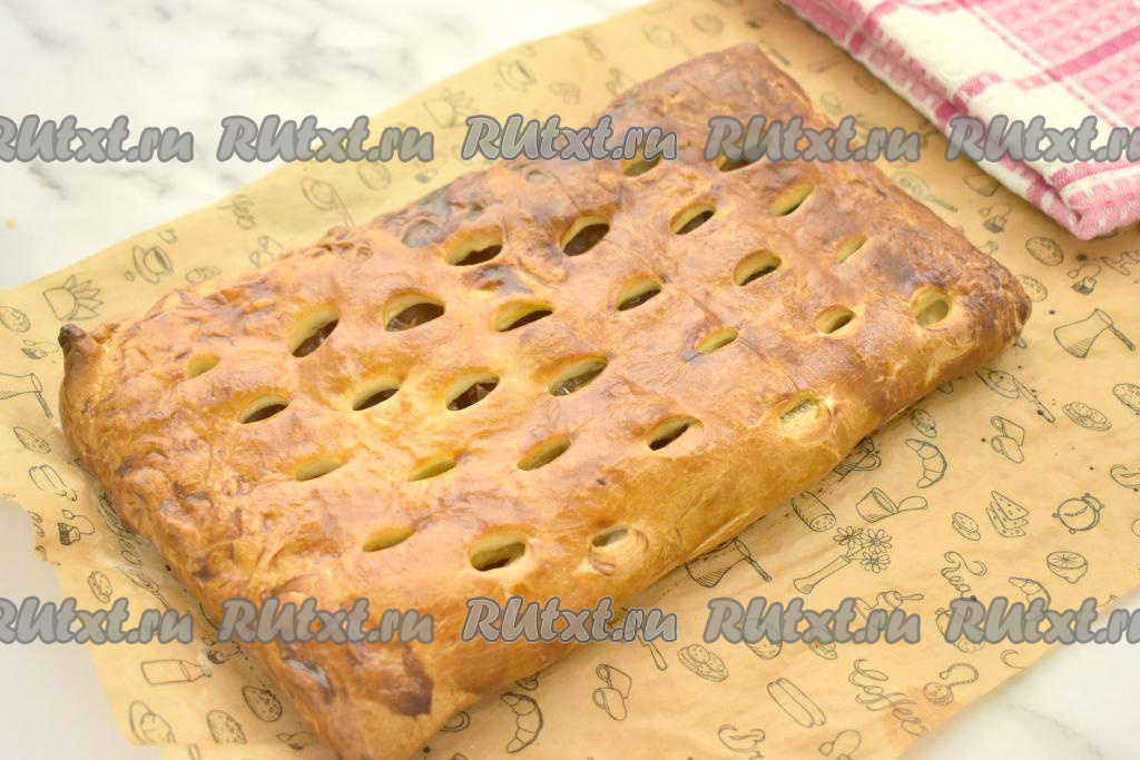 Противень с пирогом с яблочным вареньем отправляем в духовку, разогретую до 200 градусов, выпекаем минут 20-25 (до приятного зарумянивания слоёного теста).