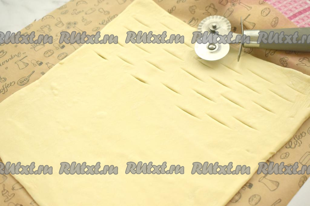 На одной половине квадрата, отступая от краёв теста по 1-1,5 сантиметра, делаем небольшие разрезы, как на фото. Я сделала разрезы ножом для нарезки пиццы и теста, можно сделать разрезы обычным ножом.