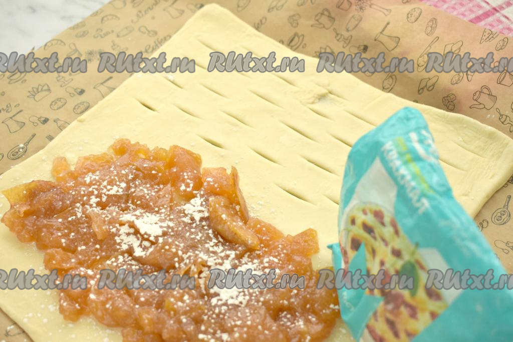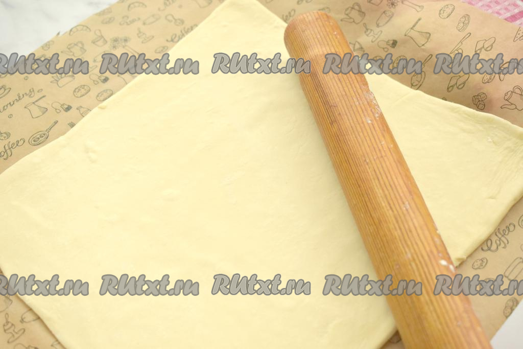 Разморозившееся слоёное тесто выкладываем на стол, припылённый мукой, и раскатываем в квадрат со стороной 29 сантиметров. Раскатанное тесто выкладываем на противень, предварительно застеленный ковриком (или бумагой) для выпечки.