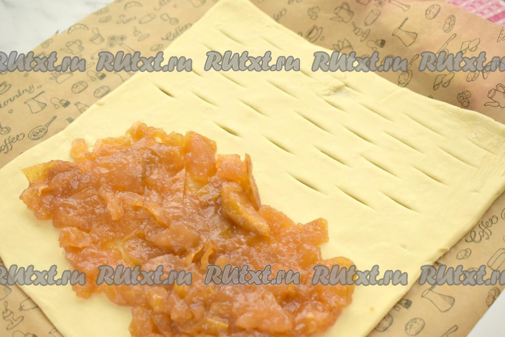 На сторону квадрата без надрезов, отступая от краёв по 1-1,5 сантиметра, выкладываем ровным слоем густое яблочное варенье (я использовала домашнее варенье из яблок).