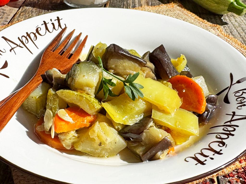 После звукового сигнала мультиварки сочное, вкусное, аппетитное овощное рагу, приготовленное с баклажанами, кабачками и перцем, разложить по тарелкам и в горячем виде подать к столу. Эти тушёные овощи станут и отличным гарниром, и прекрасным основным блюдом. Я очень люблю при подаче дополнять это рагу сметаной.