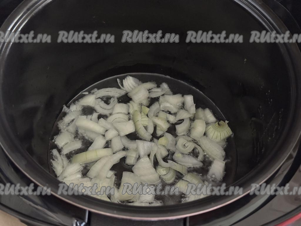В чашу мультиварки влить растительное масло. Установить чашу в мультиварку. Выставить режим "Жарка" на 10 минут. Выложить в чашу лук и обжарить его, периодически перемешивая и не закрывая крышку мультиварки, в течение 4-5 минут (до прозрачности лука).