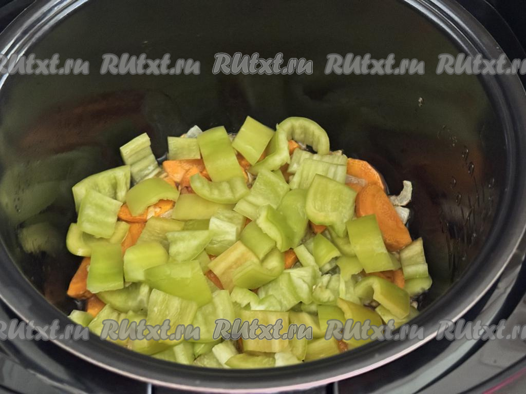 После окончания программа "Жарка" в чашу мультиварки выложить нарезанный перец.