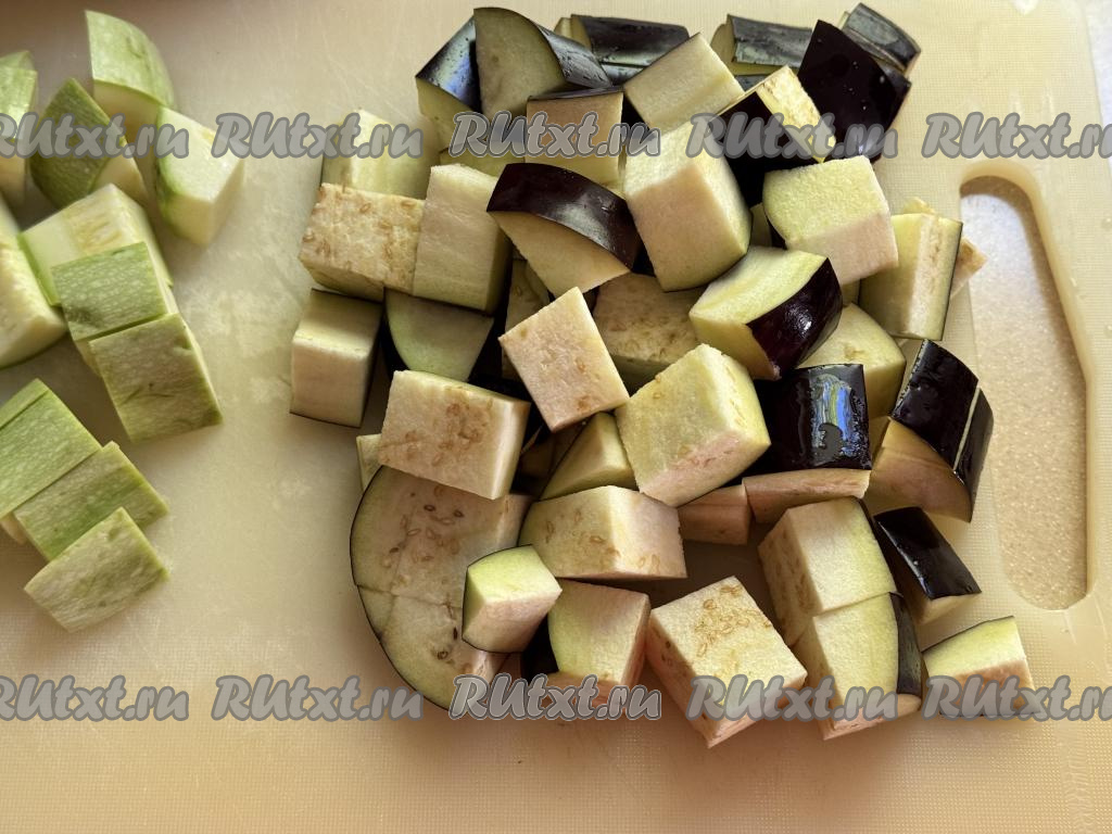 Баклажаны вымыть, обрезать кончики с двух сторон. Нарезать баклажаны на кубики такого же размера, как нарезаны кабачки.