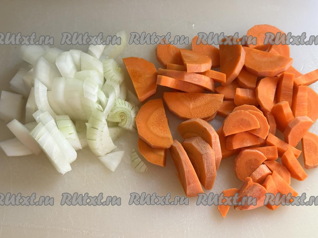 Лук нарезать на полукольца (или четверть кольца). Морковь нарезать на достаточно тонкие полукружочки.