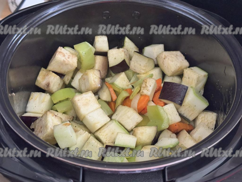 Перемешать овощи со специями и солью. Выставить режим "Тушение" и время 45 минут. Закрыть крышку мультиварки. В процессе приготовления баклажаны и кабачки выделят сок, поэтому овощное рагу будет томиться в собственном соку.