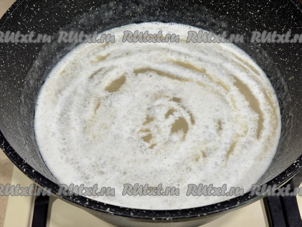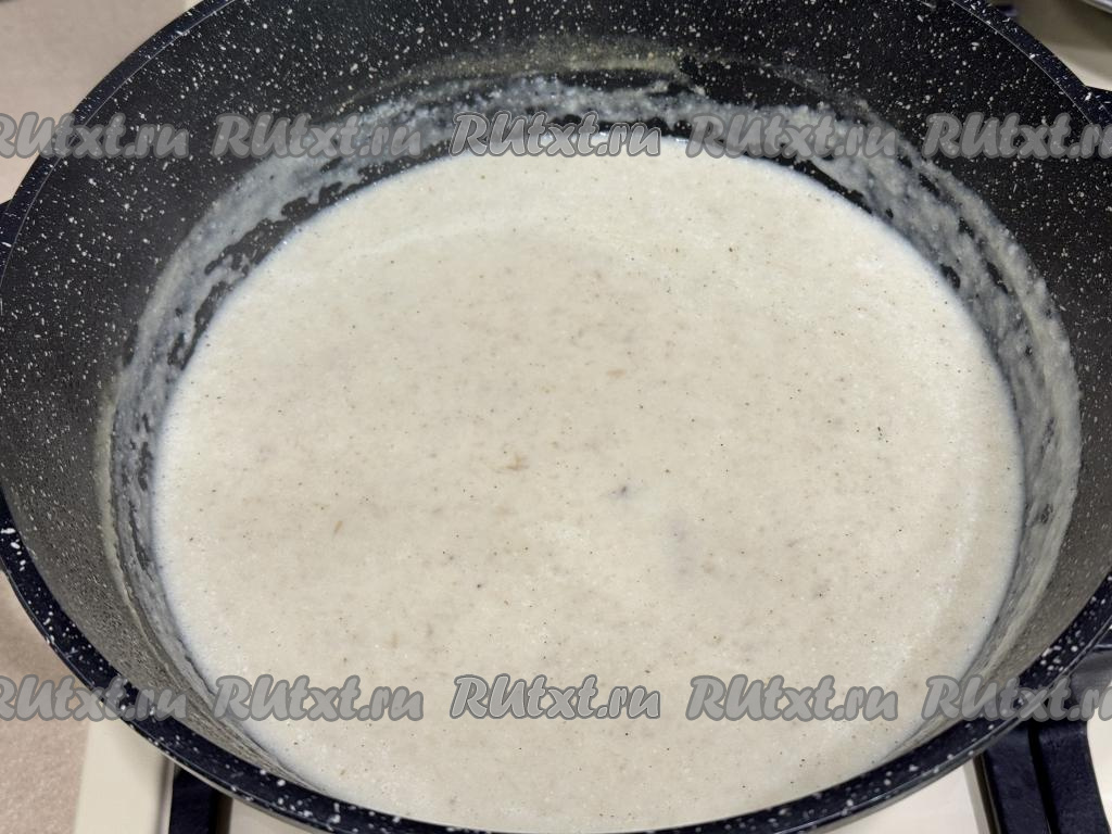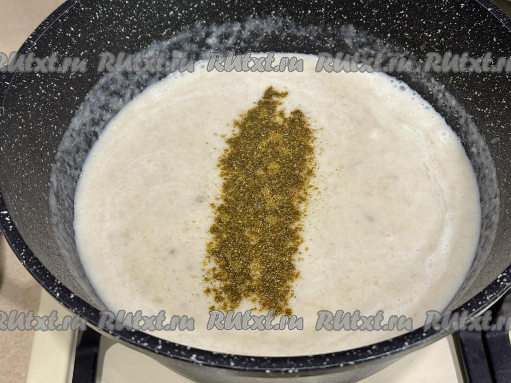 Поставить кастрюлю с грибным супом-пюре на огонь выше среднего, влить сливки, перемешать.