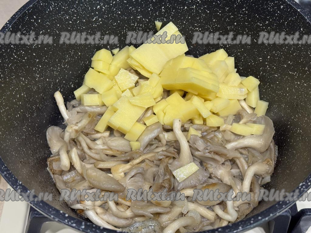 К грибам, обжаренным с луком, добавить картошку, нарезанную на кубики. Если вы обжаривали вешенки с грибами в сковороде, тогда вначале переложите их в кастрюлю, а затем добавьте нарезанный картофель.