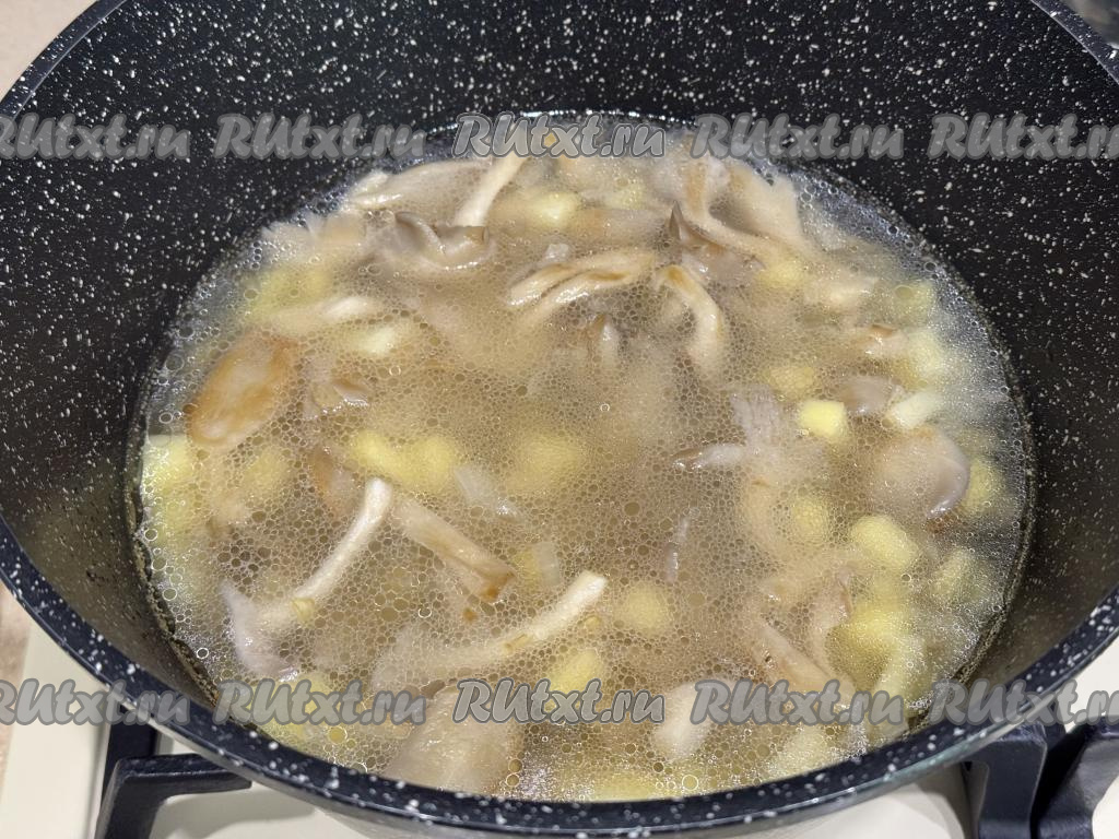 Дать воде закипеть, уменьшить огонь, варить грибной суп из вешенок 20 минут.