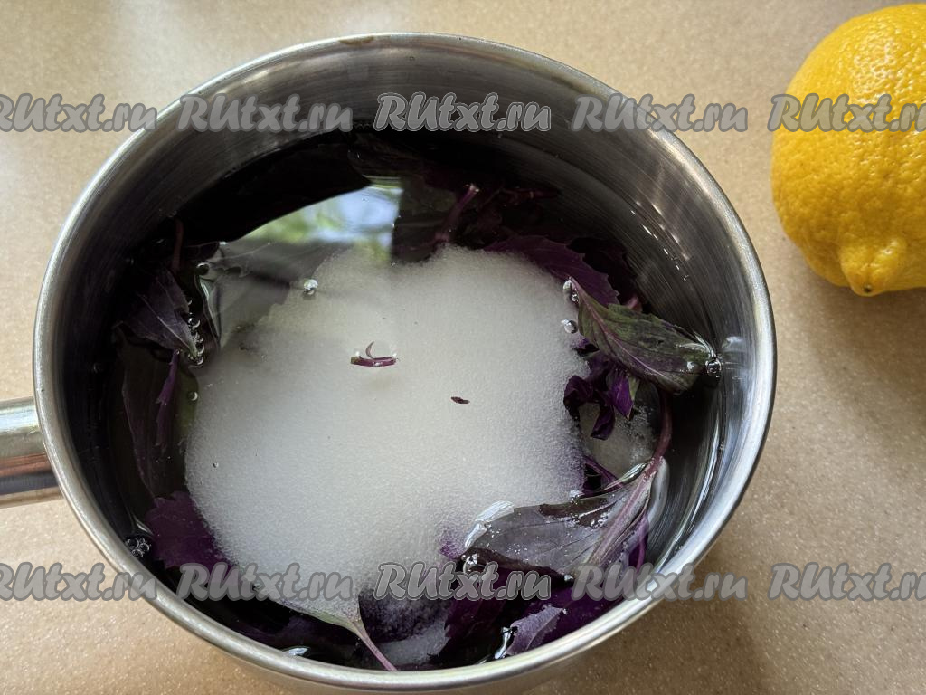 В сотейник (или в кастрюлю) с листьями базилика и водой всыпать сахар, перемешать, поставить на сильный огонь.