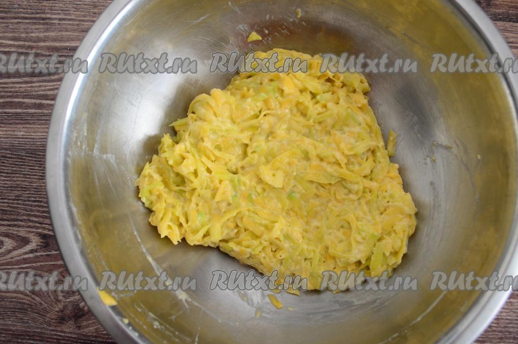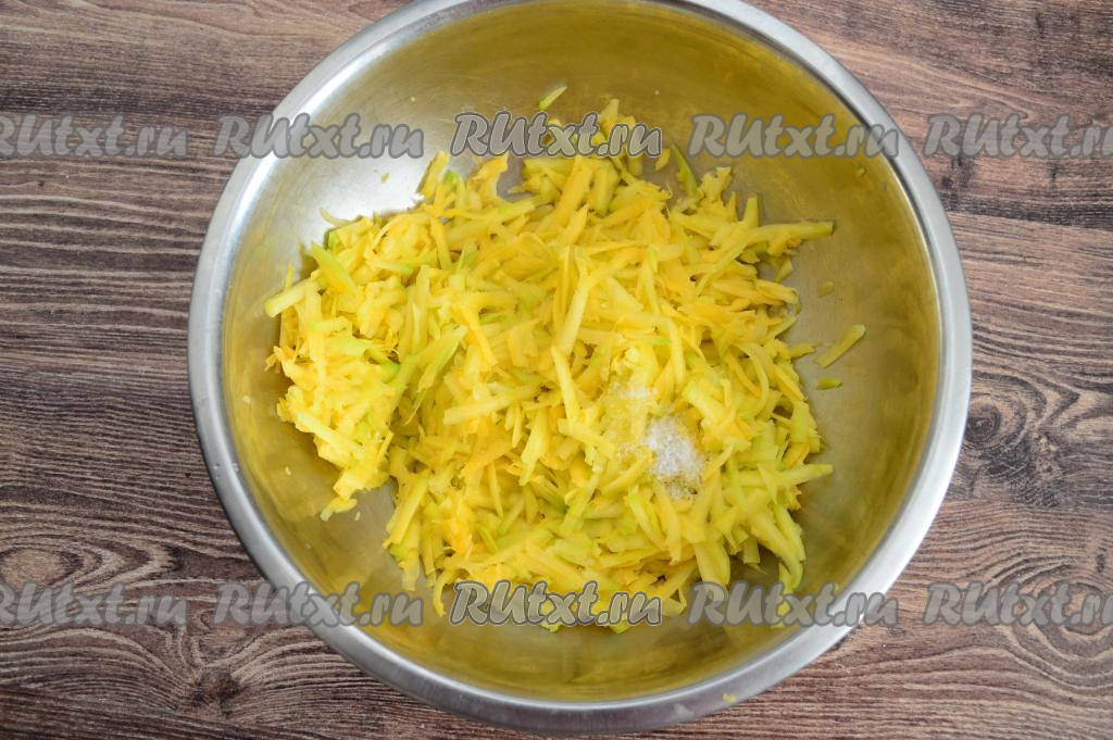 Тыкву очистить от кожуры, семечек и волокнистой части. 450 грамм подготовленной мякоти тыквы натереть на крупной тёрке в глубокую миску, всыпать соль, перемешать и оставить на 5 минут, чтобы тыква пустила сок.