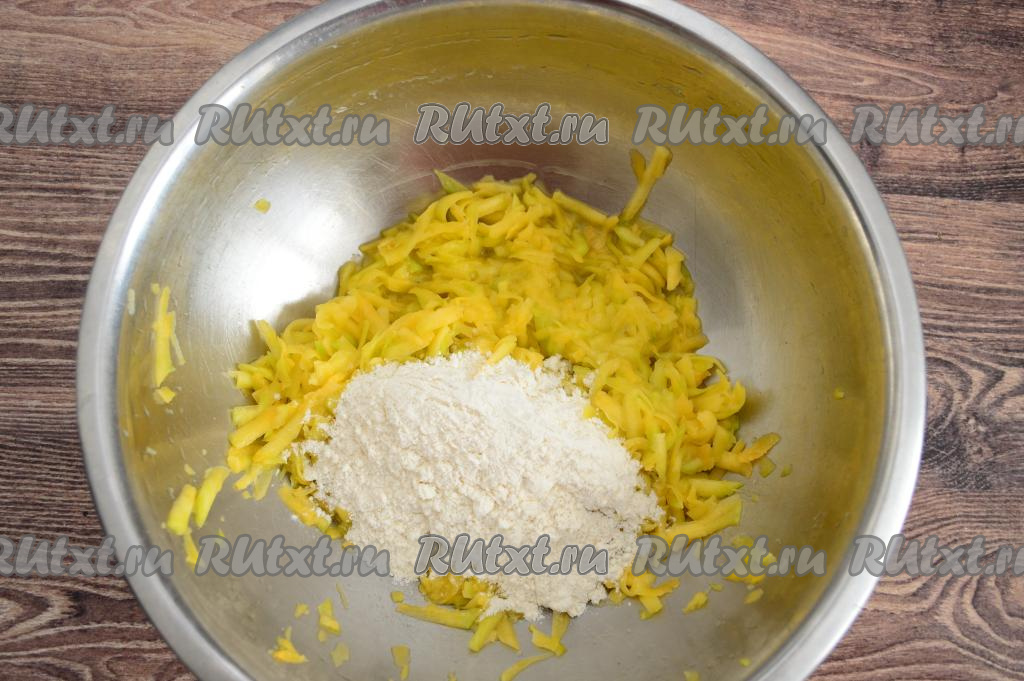 По прошествии 5 минут начать добавлять к тыкве по 1 столовой ложке муки, каждый раз очень хорошо вмешивая её в тыквенное тесто для оладий.