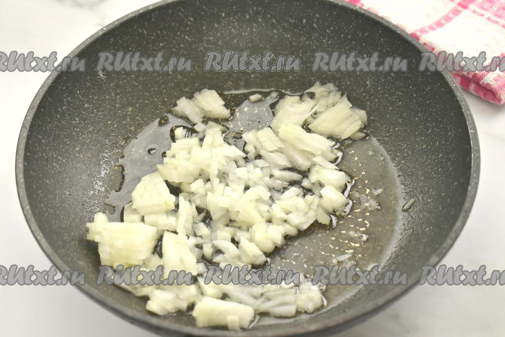 Пока варится булгур, займёмся обжариванием овощей. Лук и морковь очищаем. Моем капусту, морковку и лук. Прогреваем растительное масло в сковороде, выкладываем мелко нарезанный лук, обжариваем его на среднем огне до прозрачности (ориентировочно в течение 3-4 минут), иногда помешивая.