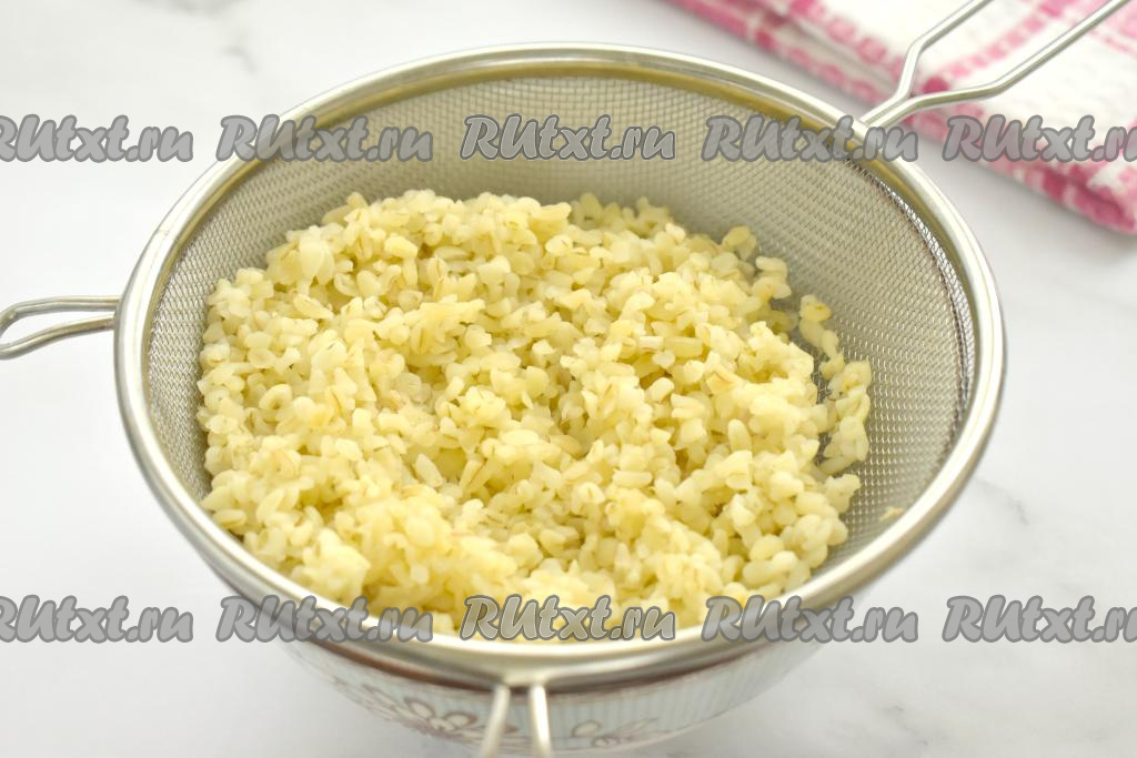 В небольшой кастрюле доводим до кипения 300 миллилитров воды, выкладываем сухой булгур (промывать эту крупу перед варкой не нужно), доводим до кипения, уменьшаем огонь. Варим булгур 15 минут (до полуготовности), затем откидываем на сито. Оставляем в сите на несколько минут, чтобы стекла вода и булгур остыл.