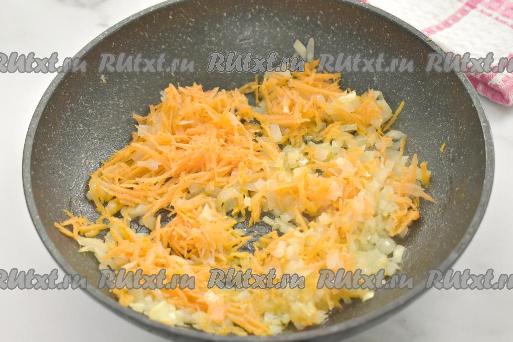 К обжаренному луку выкладываем морковку, натёртую на крупной тёрке, перемешиваем и обжариваем, время от времени перемешивая, минут 5 (до мягкости моркови).