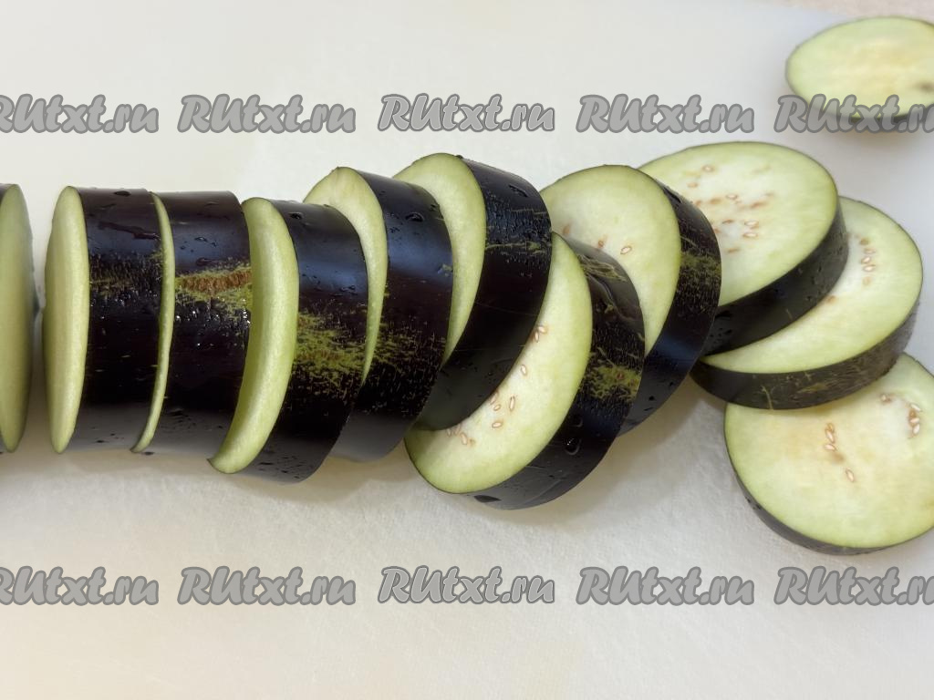 У баклажана отрезать хвостик. Нарезать баклажан на кружочки толщиной примерно 1 сантиметр.