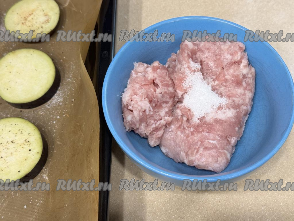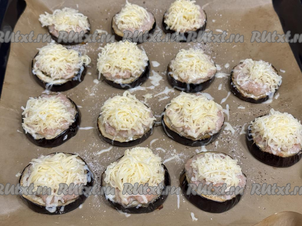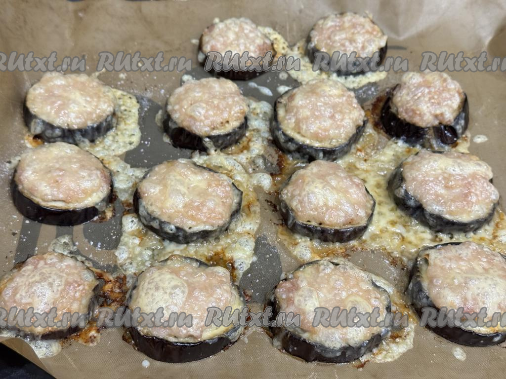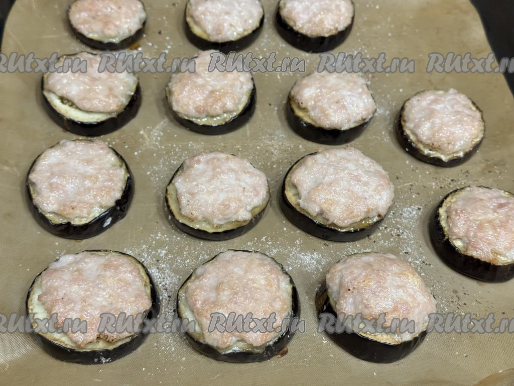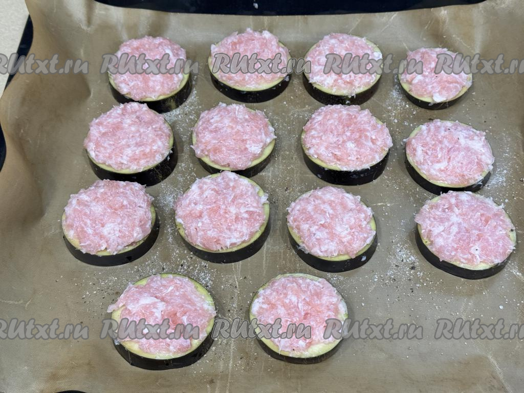 Разложить фарш поверх каждого кружочка баклажана.