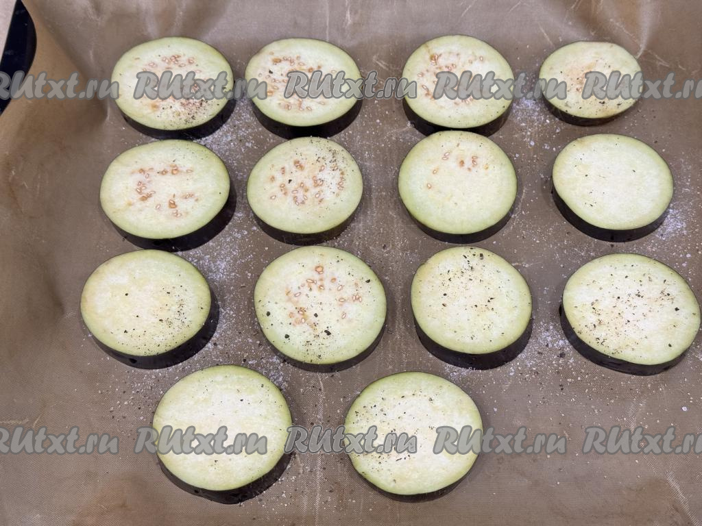 Противень застелить ковриком (или пергаментом) для выпечки, выложить кружочки баклажана. Каждый кружочек слегка присолить и присыпать чёрным молотым перцем. Всего у меня получились 14 кружочков.