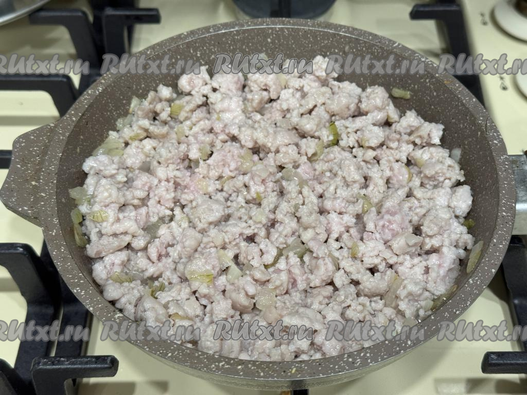 К луку, обжаренному до прозрачности, выложить мясной фарш.