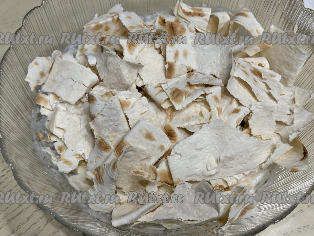 Остальной лаваш порвать руками (или нарезать кухонными ножницами) на кусочки, выложить в миску со смесью из кефира и яиц.