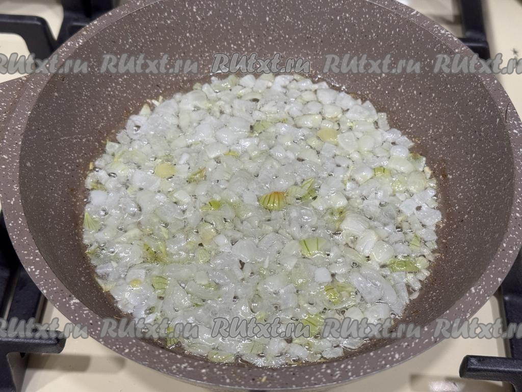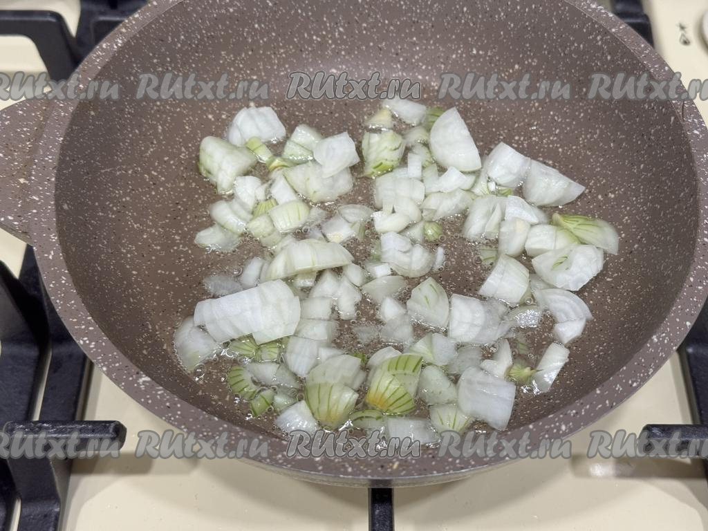 Обжарить лук, периодически перемешивая, до прозрачности (примерно в течение 4-5 минут).