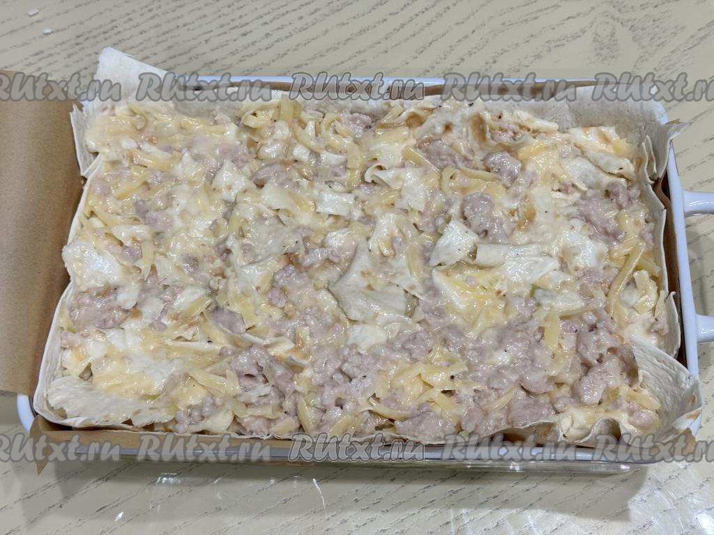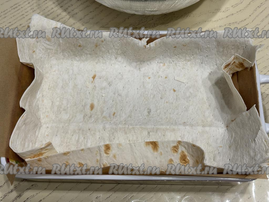 Форму для выпечки выстелить листом лаваша так, чтобы бортики формы тоже были застелены.