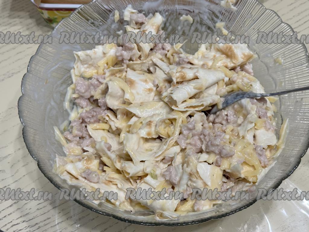 Перемешать лаваш с фаршем и сыром.