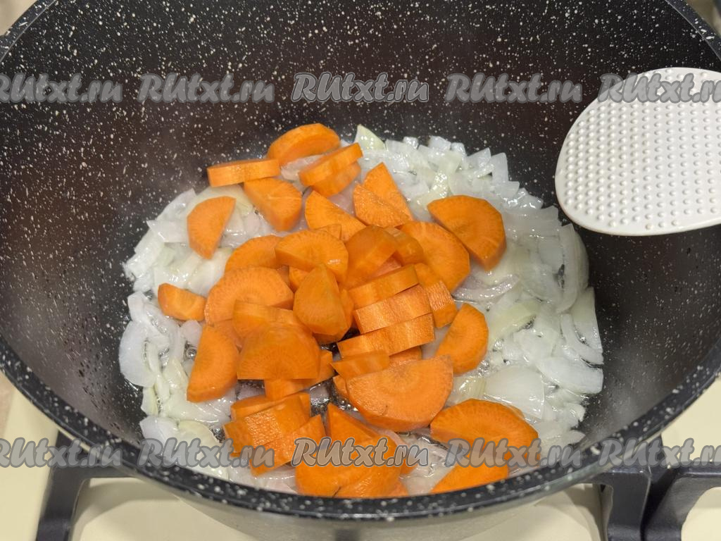Обжарить лук в течение 5 минут (до прозрачности), иногда помешивая, на среднем огне. Морковь нарезать на полукружочки, добавить к луку, перемешать, обжаривать 5 минут, время от времени помешивая.