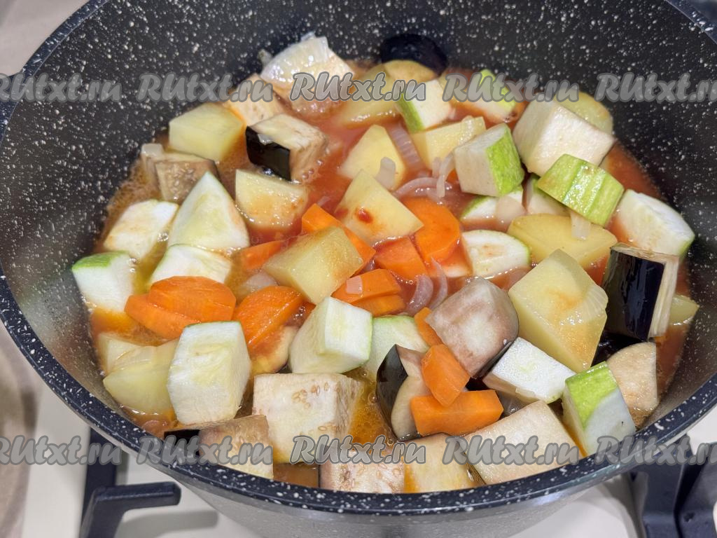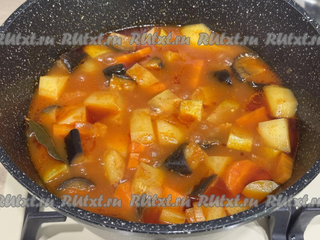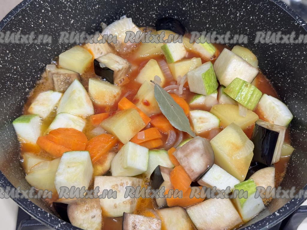 Добавить лавровый лист, перемешать овощи. Довести соус до кипения, уменьшить огонь, тушить картошку с кабачками и баклажанами под крышкой на небольшом огне 25 минут. В течение этот время овощное рагу нужно 2-3 раза перемешать.