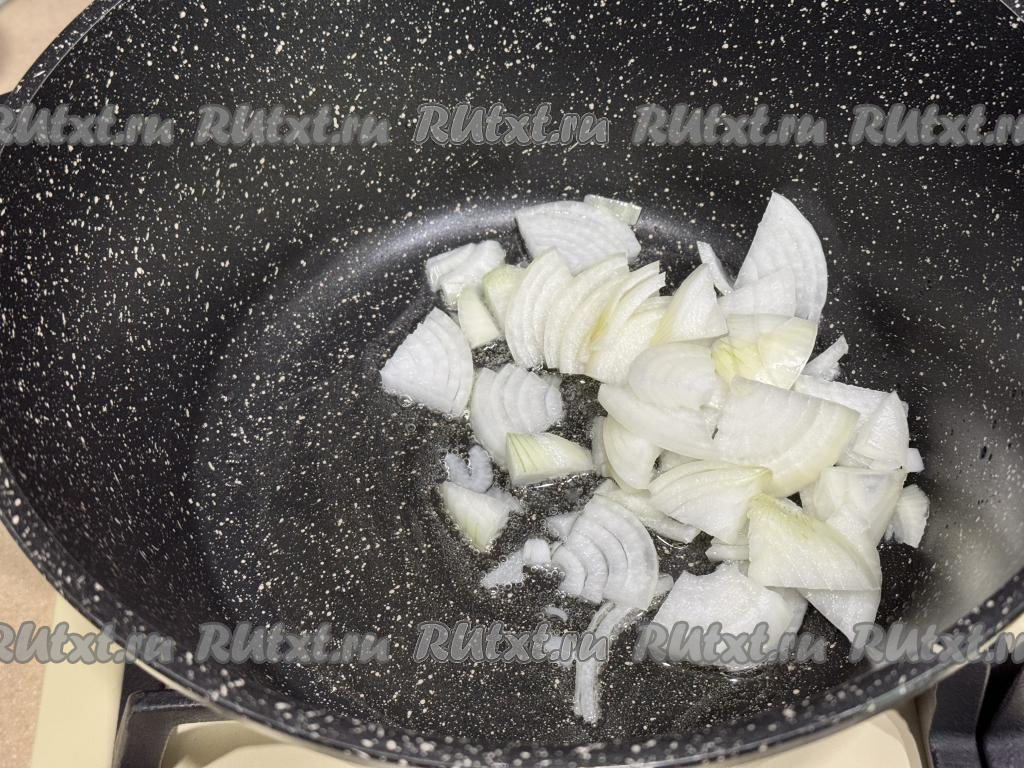 В глубокую сковороду (или в кастрюлю с толстым дном) влить растительное масло, поставить на огонь. В разогревшееся масло выложить лук, нарезанный четверть кольцами.