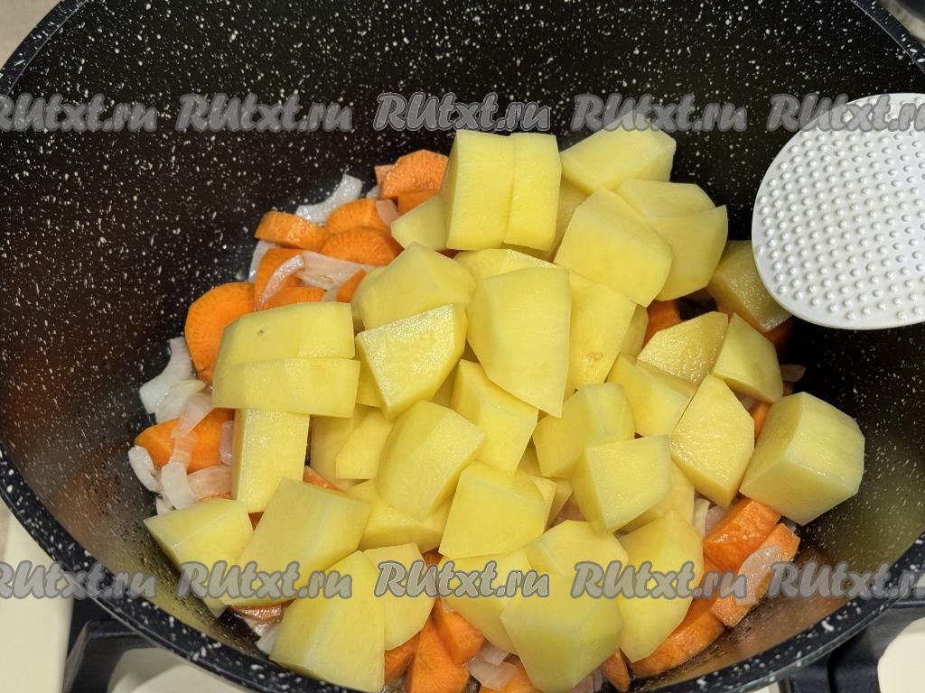 Далее добавить картофель, нарезанный на средние дольки, перемешать, обжарить в течение 5 минут, иногда перемешивая.