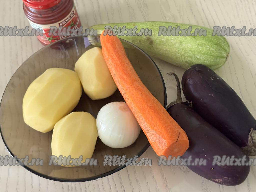 Подготовить продукты. Картошку, морковь и лук почистить. Картошку выложить в миску, залить полностью холодной водой, чтобы картофель не потемнел, пока мы будем заниматься другими овощами. Баклажаны вымыть. Кабачок я взяла с тонкой кожицей и мелкими семечками, поэтому просто обрезала у него кончики с двух сторон и промыла водой. Если у кабачка жёсткая кожура - её нужно будет срезать, крупные семечки нужно будет удалить.