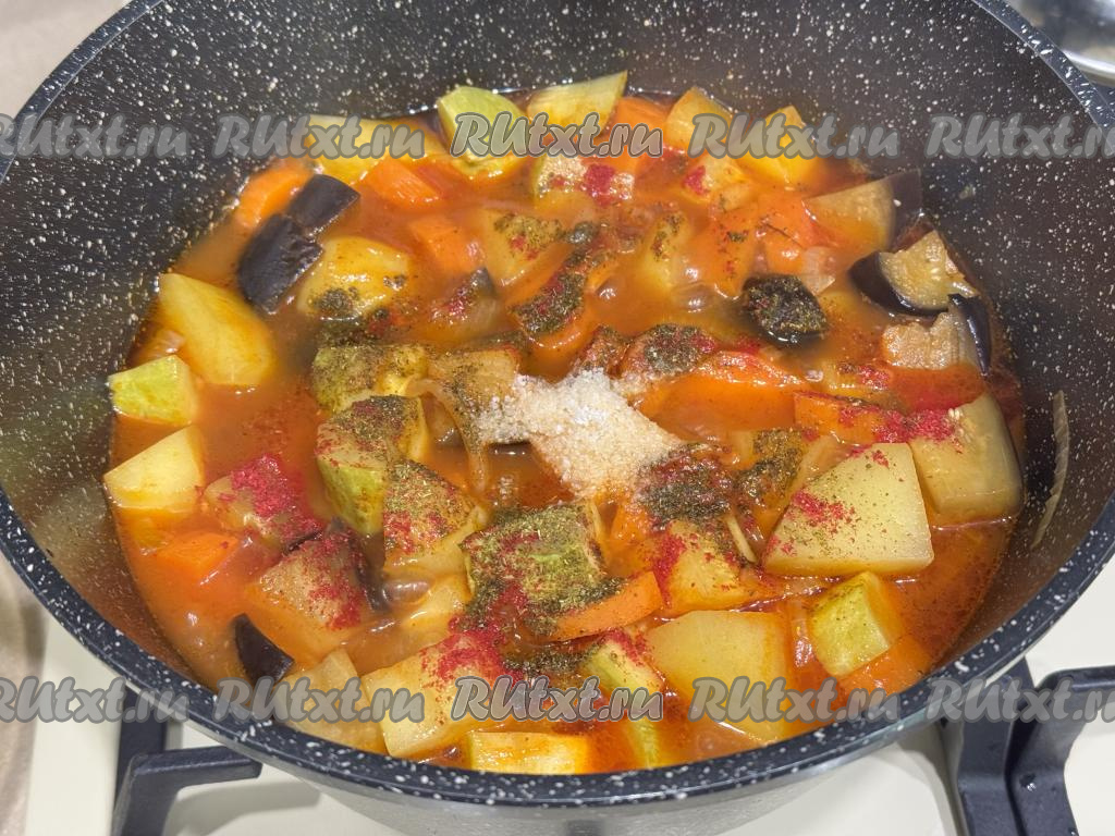 Затем посолить овощи, приправить любимыми специями, перемешать и готовить под крышкой 5-10 минут (до готовности). Готовность блюда определяем по картошке и моркови, они должны стать достаточно мягкими, легко прокалываться ножом.