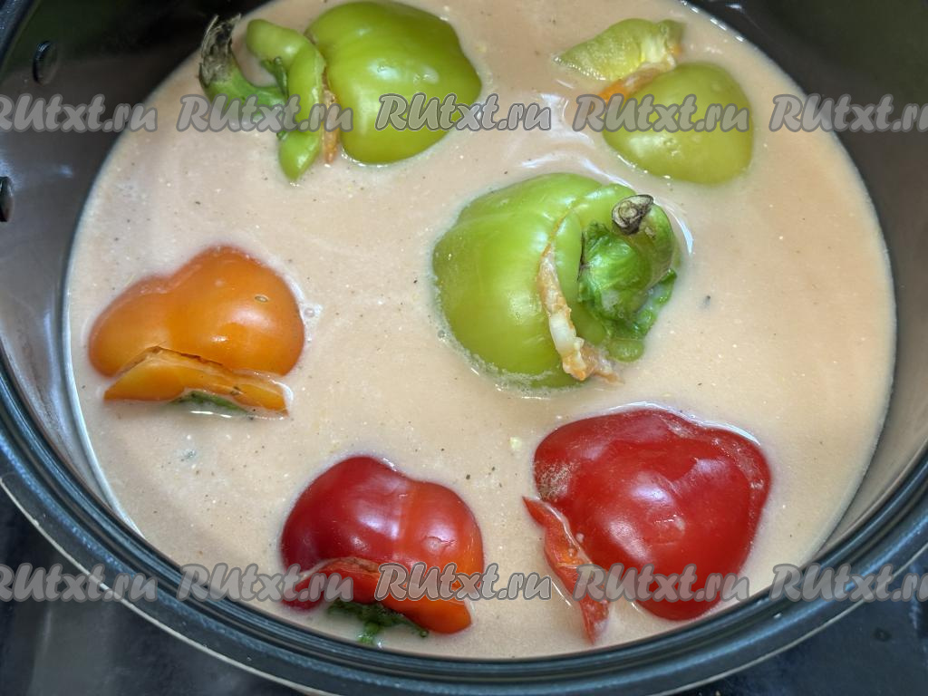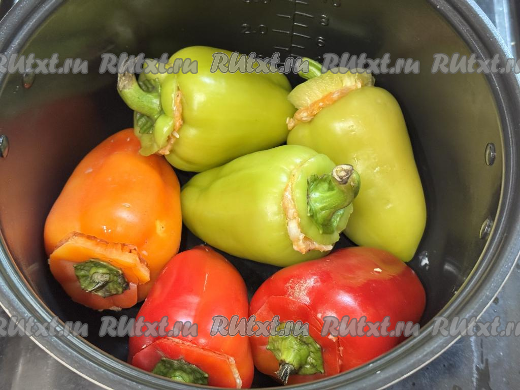 Фаршированные болгарские перцы накрыть "крышечками" и выложить в чашу мультиварки.