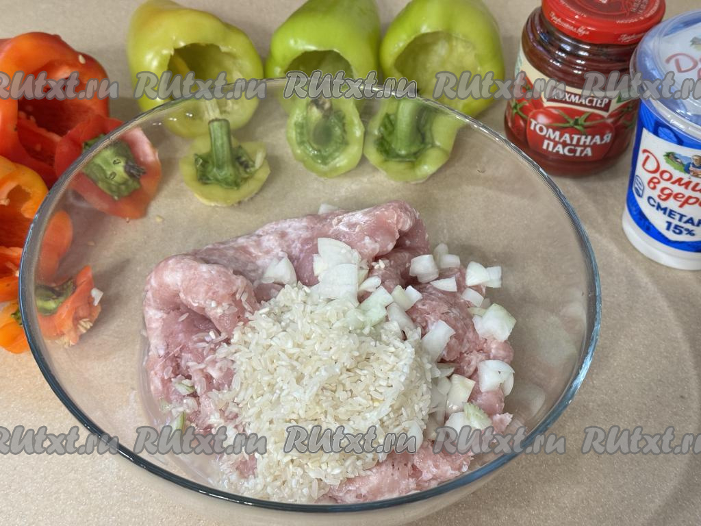 Из болгарского перца удалить семена с перегородками, аккуратно отрезав верх перцев ("хвостики" из отрезанного верха я удалять не стала). Отрезанные части перцев станут "крышечками" для фаршированных перцев. Промыть перцы водой. Рис выложить в сито, промыть водой, лишней воде дать стечь. Отваривать рис предварительно не нужно, он успеет приготовиться в процесс тушения фаршированных перцев в мультиварке. Лук очистить, мелко нарезать (или пропустить через мясорубку). В миску с фаршем добавить лук и промытый рис.