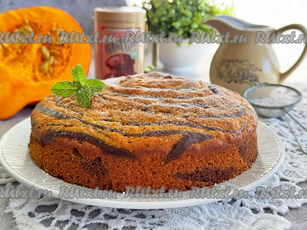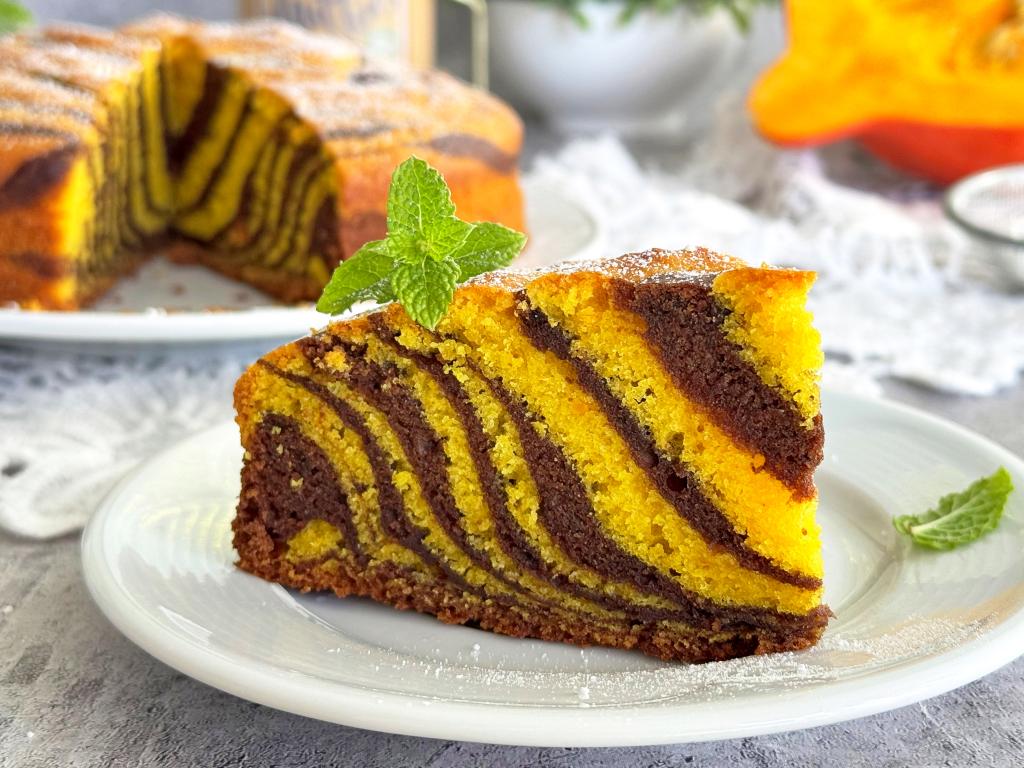 Достать готовый тыквенный пирог "Зебра" из духовки, дать ему немного остыть, после этого вынуть из формы и переложить на тарелку. Перед подачей, по желанию, выпечку можно присыпать сахарной пудрой.