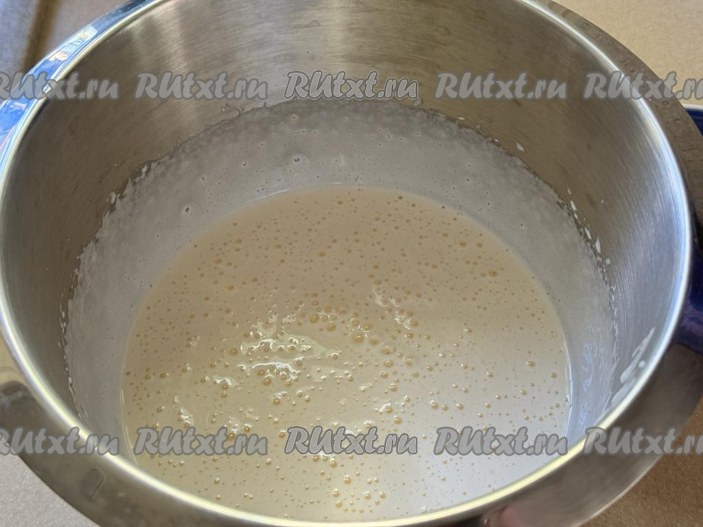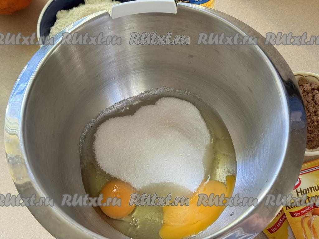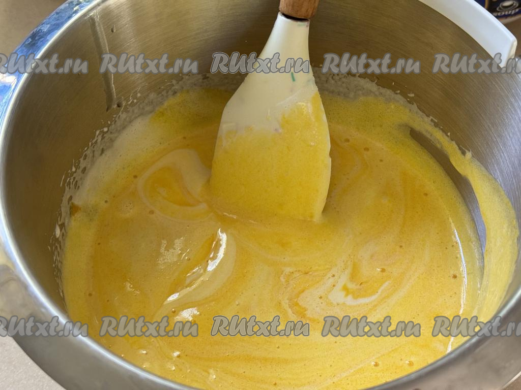 Взбить миксером на максимальной скорости сахар с яйцами в течение 4 минут (яичная масса должна посветлеть, стать более пышной).