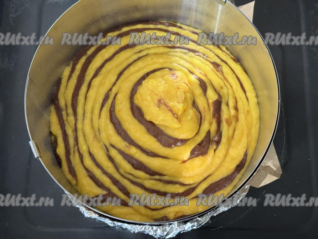 Взять разъёмную форму для выпечки диаметром 20 сантиметров, смазать её дно и бока растительным маслом. В качестве формы я взяла разъёмное кулинарное кольцо диаметром 20 сантиметров, дно формы сформировала из фольги, сложенной в несколько слоёв, и пергамента, а затем получившуюся форму поставила на противень. В подготовленную форму вначале выложить 1 столовую ложку тыквенного теста, в центр этого теста выложить 1 столовую ложку шоколадного теста, затем в центр шоколадного теста выложить 1 столовую ложку тыквенного теста.