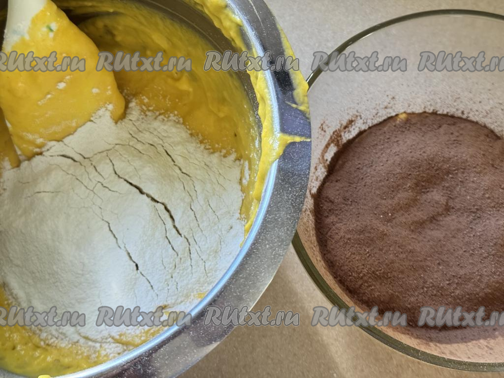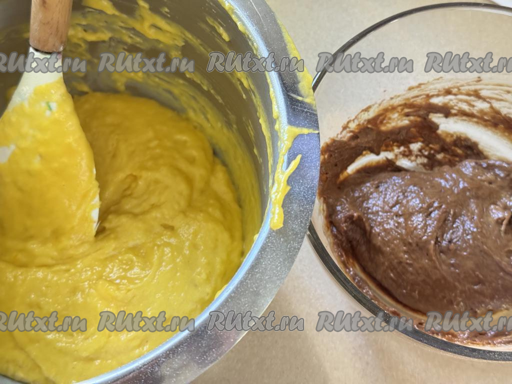 В результате в одной миске у нас будет жёлтое тыквенное тесто, а в другой - шоколадное тесто.