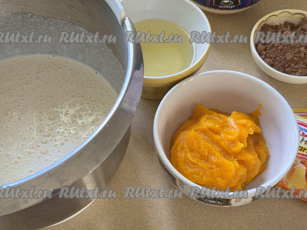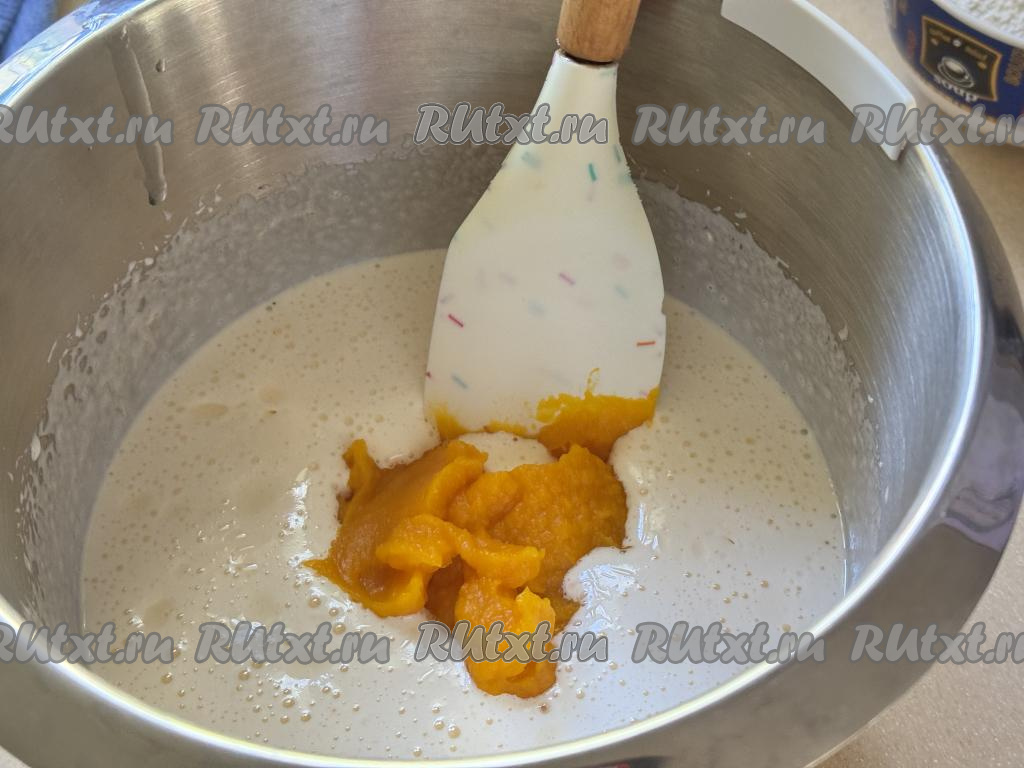К яйцам, взбитым с сахаром, добавить растительное масло, соль и тыквенное пюре.