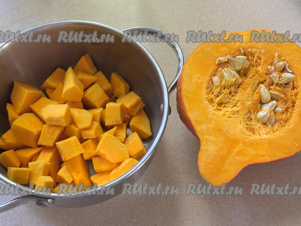 200 грамм тыквы, очищенной от кожуры и семян, нарезать на небольшие кубики, выложить в кастрюлю.