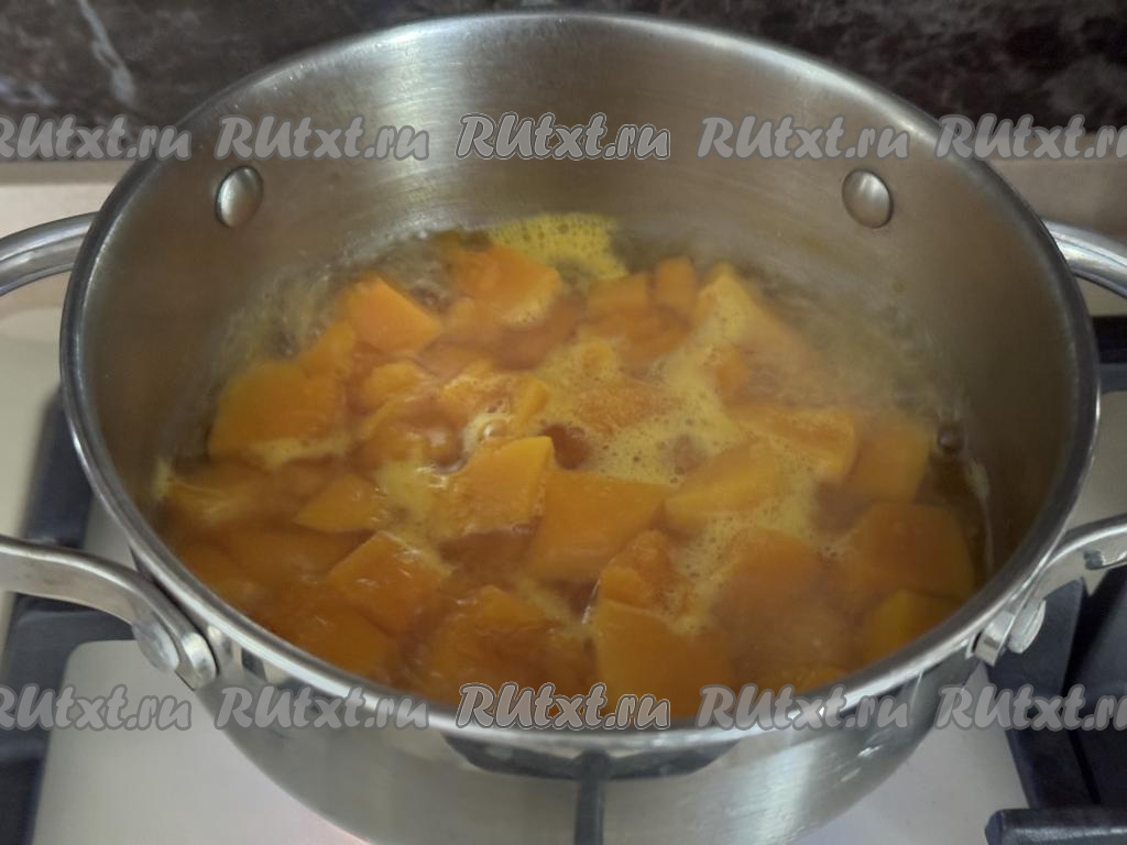 В кастрюлю с тыквой влить столько воды, чтобы она полностью покрывала тыкву, поставить на огонь. С момента закипания воды варить тыкву на небольшом огне до мягкости (минут 20).