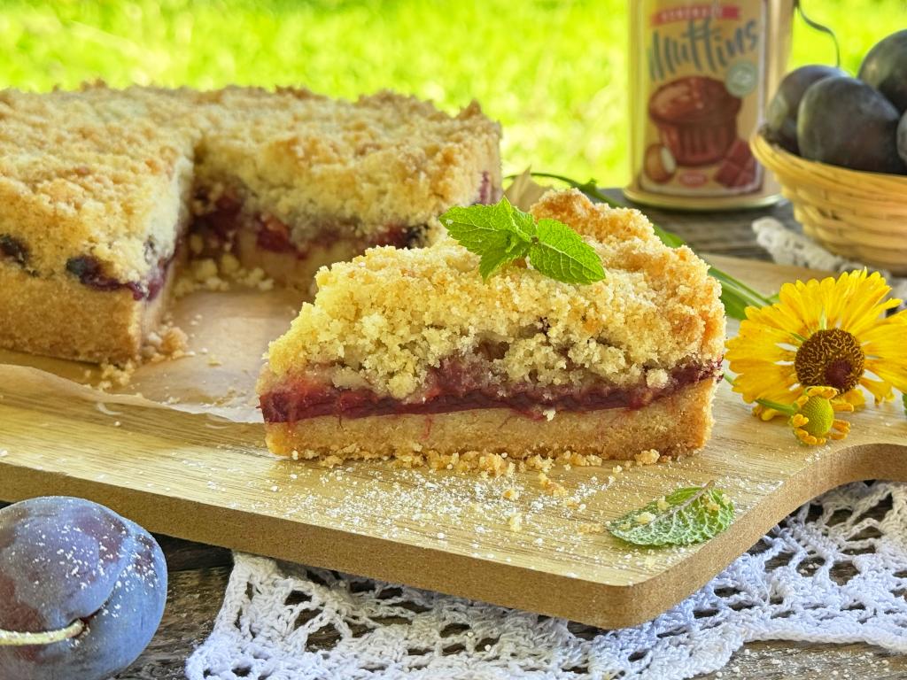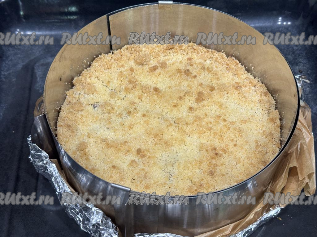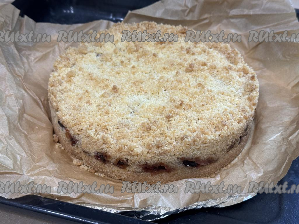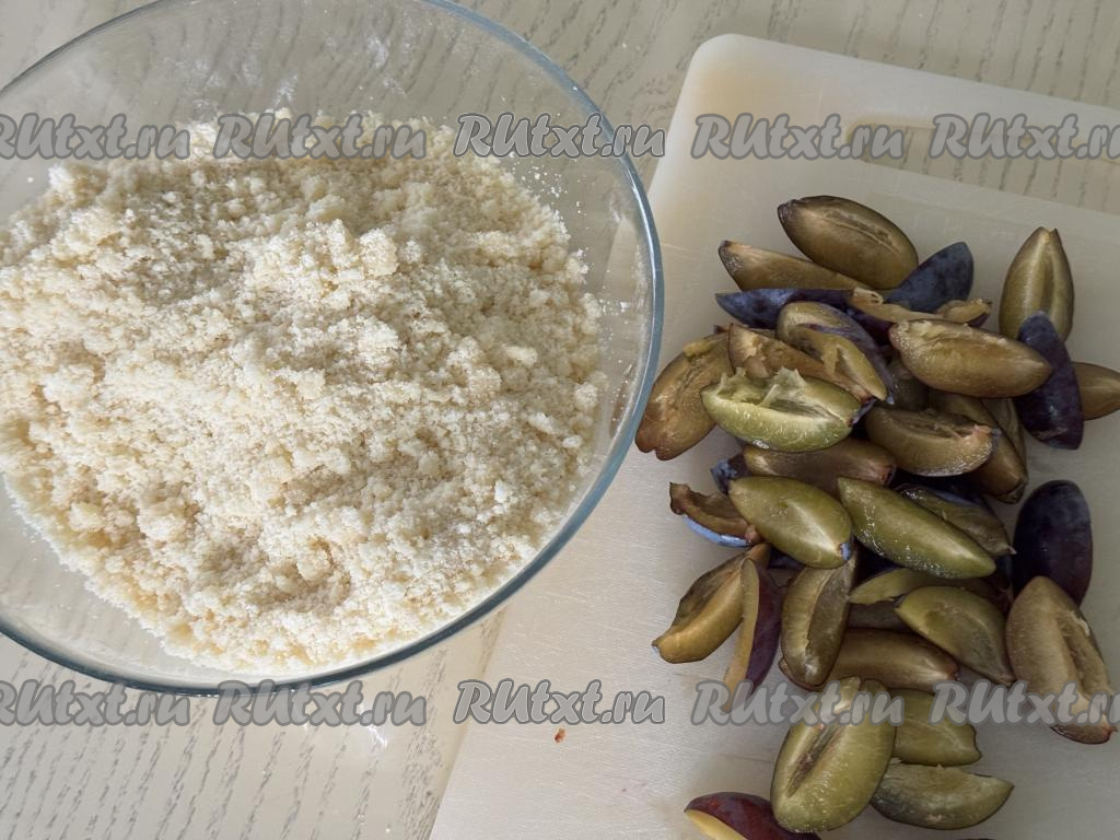 Равномерно разложить поверх слив оставшуюся песочную крошку, покрывая все фрукты.