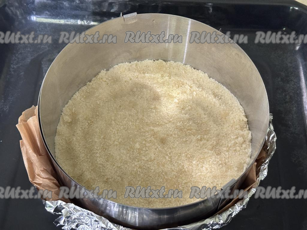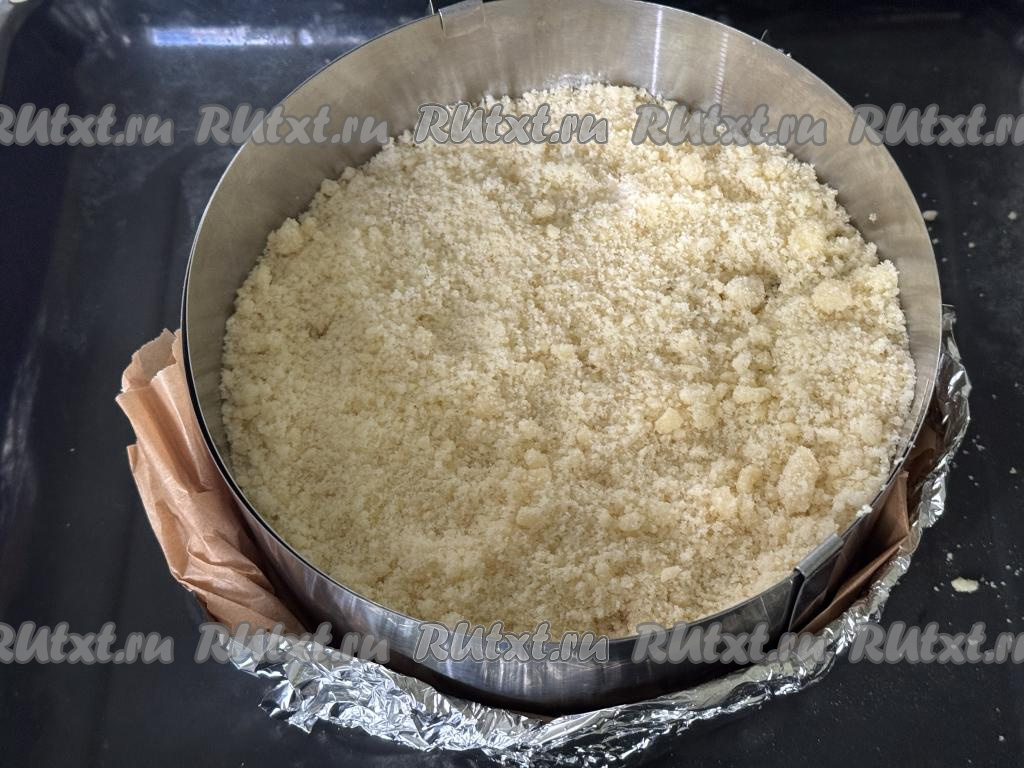 Взять разъёмную форму для выпечки диаметром 20 сантиметров, немного смазать растительным маслом. Я в качестве формы использовала кулинарное кольцо диаметром 20 сантиметров, дно сформировала из фольги, сложенной в несколько слоёв, и пергамента, получившуюся форму поставила на противень. В подготовленную форму выложить половину песочной крошки, немного утрамбовать.